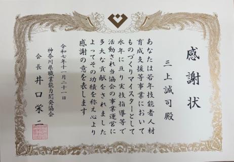 神奈川県職業能力開発協会・会長 井口栄二様より感謝状を受領いたしました。